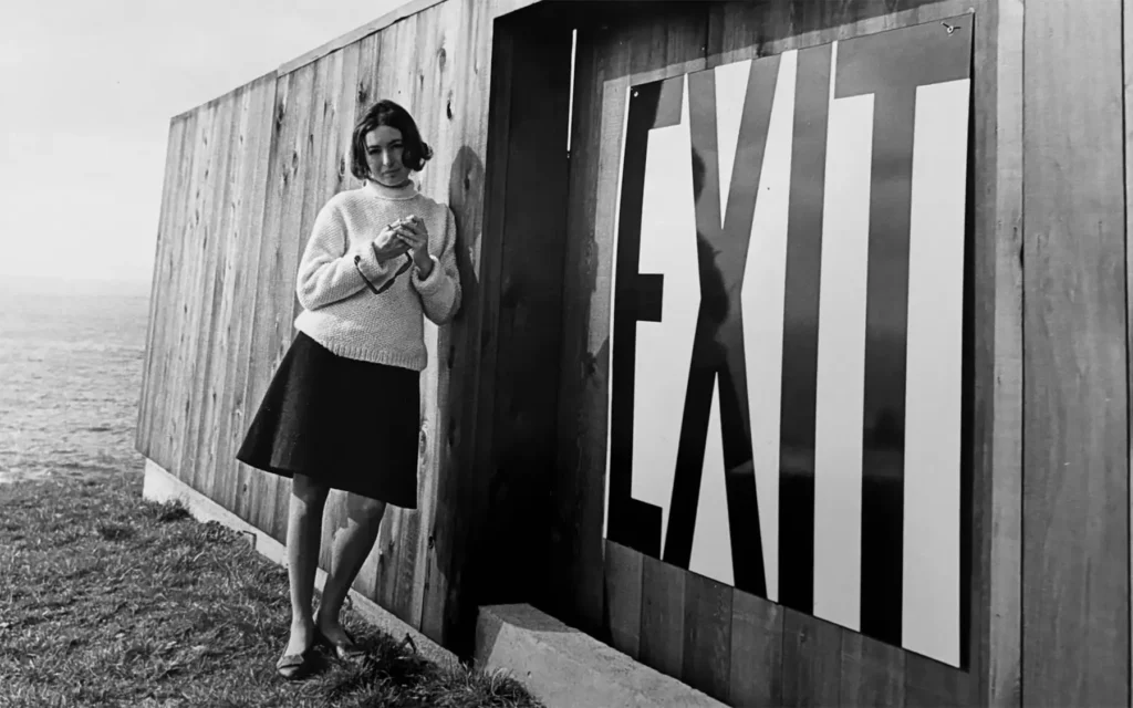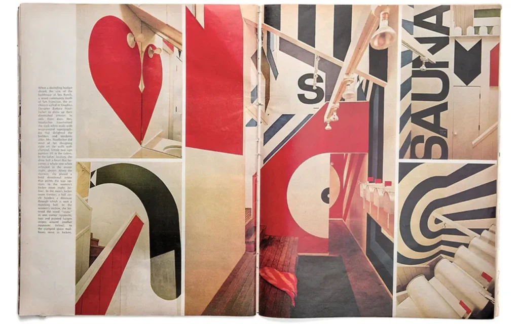 Sea Ranch je bio njen prvi veliki posao — eksperimentalna zajednica na obali Sonome, gde je osmislila logo i svu štampanu materiju koristeći Helvetiku, a zatim čistim bojama naslikala jednostavne geometrijske forme na istrošenom drvetu zgrada — džinovske talase, vertikalne i kose pruge, krugove, strelice i crvena srca — uz signalizaciju velikim slovima. Kada je Life magazine 1966. objavio priču o Sea Ranchu, njene supergrafike su bile ono što je zauzelo naslovnicu. Supergrafika je bila arhitektura drugog reda — vizuelni sistem koji je menjao kako telo doživljava prostor, kako oči čitaju veličinu prostorije, kako se kretanje organizuje kroz zgradu.