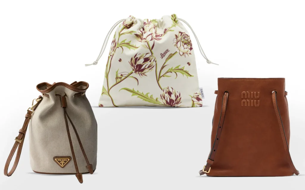 Loewe je drawstring pouch napravio od meke kože u bojama koje nisu otišle ni u luxe ni u casual, već negde između. Miu Miu je otišla prema teksturiranoj koži i proporcijama koje primaju ono najvažnije. Prada je zadržala klasični oblik i boje i tako se održala na modnom vrhu. Svaki od ovih pristupa govori isto: vrećica je tu da ostane.