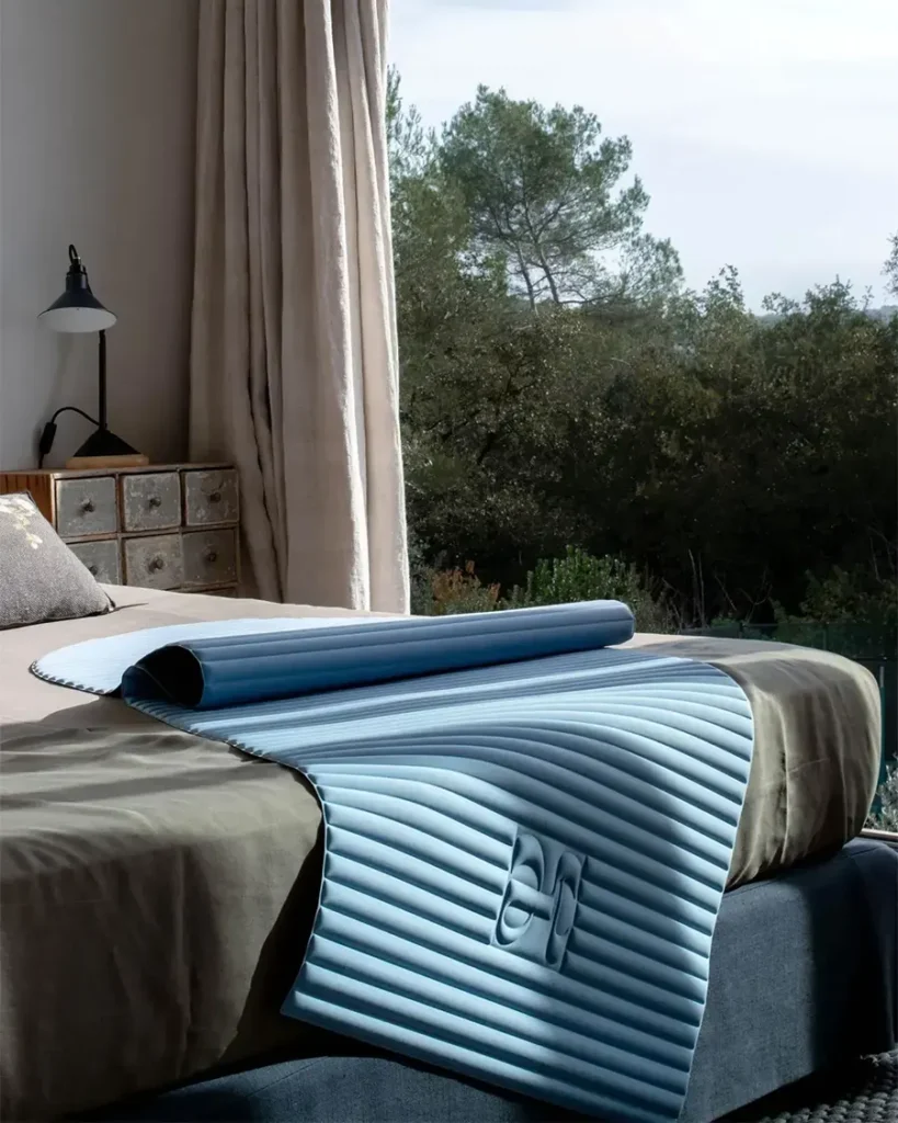 Centralni proizvod Hercule Studija je Archy podloga — fitnes prostirka koja na prvi pogled liči na skulpturu više nego na opremu. Karakteristični reljefni uzorak na površini, zaobljeni gornji rub inspirisan mediteranskom arhitekturom, paleta boja koja se kreće od terakote i pistachio zelene do crne — boje inspirisane radom francuskog slikara Pjera Sulaža i njegovim opsesivnim istraživanjem svetlosti kroz crnu površinu. Pored Archy prostirke, brend nudi Mar joga podlogu sa talasastim dizajnom inspirisanim dekorom sedamdesetih, Galé comfort pad — minijaturnu trodimenzionalnu podlogu za kolena, laktove i leđa koja se može koristiti na reformeru ili tokom putovanja — kao i Soca remen za nošenje, napravljen od biljno štavljene kože i pamučne tkanine, koji izgleda kao da je izašao iz modnog atelijea, a ne iz sportske prodavnice.