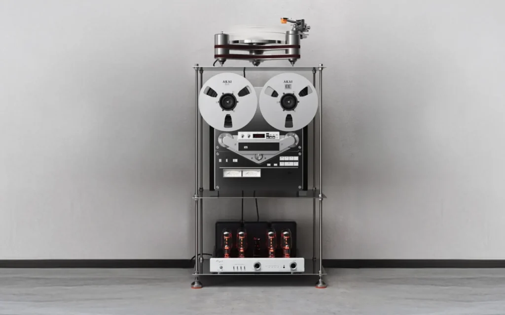 Katalog pokriva nešto što se teško stavlja u jednu kategoriju: od stalka za vinil ploče i CD plejera do zvučnika i TV klupe. Sve od aluminijuma, nerđajućeg čelika i belog drveta. Inspiracija dolazi od Tadaa Andoa, Le Korbizijea i Ditera Ramsa, majstora koji su verovali da forma služi životu, a ne obrnuto. M-618 stalak za vinil je geometrijska konstrukcija koja izgleda kao da pripada i arhitektonskoj izložbi. M-470 zvučnici su zidni, ravni, bez ikakvih elemenata koji bi ih izdvajali od zida osim sopstvene forme. M-159 CD plejеr ima dugmiće koji izgledaju kao da su deo instrumenta, ne uređaja. M-2000 TV klupa od drveta i aluminijuma nosi TV ekran do sto inca i razvija patinu kako stari, što znači da postaje lepša vremenom.