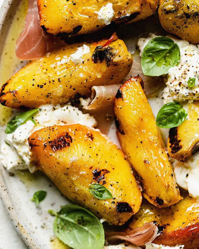 Ovo je salata koja ne podnosi žurbu, jer je namenjena onim hedonistima koji ništa ne prepuštaju slučaju. Potrebne su zrele, sočne breskve koje ćete kratko zapeći na roštilju ili u tiganju, tek toliko da šećeri polako krenu da se karamelizuju i razviju blagu dimljenu notu.
