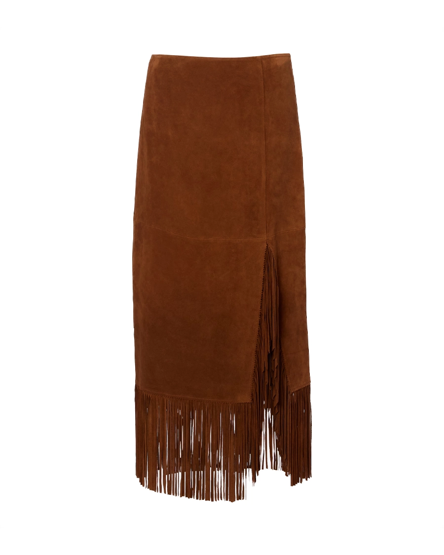 Na prvi pogled, Polo Ralph Lauren midi suknja sa resama može delovati kao referenca na neku boho ili „prerijsku” estetiku. Međutim, u praksi funkcioniše mnogo modernije. Brušena koža daje težinu i strukturu, dok rese unose pokret bez preterane dramatike. Midi dužina dodatno smiruje siluetu i čini je nosivom u različitim kontekstima. Ovde romantika ne dolazi kroz očekivane elemente poput čipke ili prozirnosti, već kroz teksturu i dinamiku materijala. Uz jednostavnu košulju i čizme, ovaj komad lako postaje centralni deo outfita.