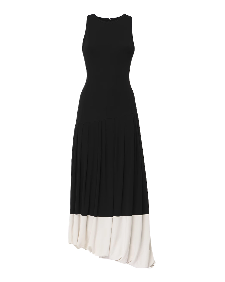 Victoria Beckham midi haljina pokazuje da romantika ne mora biti očigledna da bi bila prisutna. Kolorblok je precizan i funkcionalan — prati liniju tela bez naglašavanja, dok džersi materijal omogućava kretanje bez gubitka forme. Sve je svedeno i promišljeno. Ovo je primer kako se ideja nežnosti može izraziti kroz konstrukciju, bez potrebe za dekoracijom. Estetika koju Beckham godinama gradi ovde dolazi do punog izražaja.