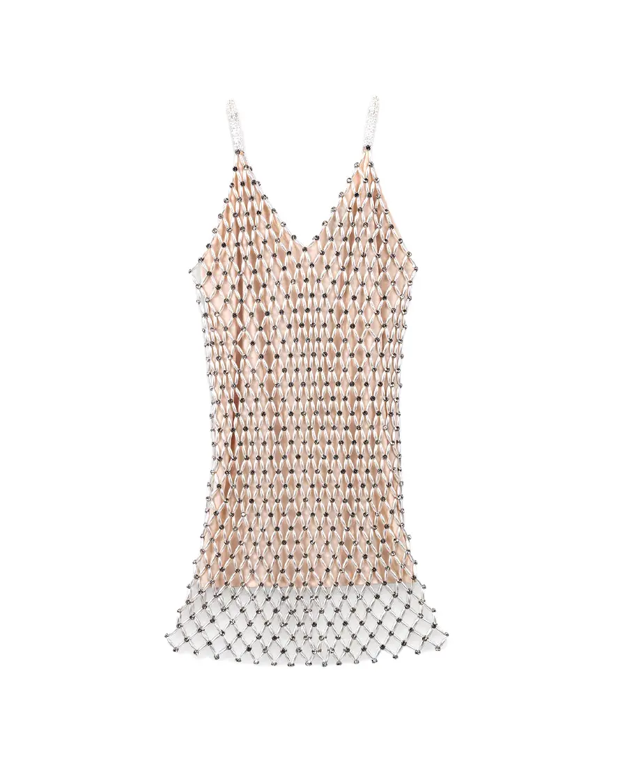 Kratka haljina sa perličastim vezom i postavom je večernji komad koji ne izgleda kao večernji komad dok ga ne obučete, a onda shvatite zašto je najupečatljiviji u celoj kolekciji. Satenska postava i mrežasti gornji deo u potpunosti prekriven biserno-antracitnim perlicama koji hvata svetlost pri svakom pokretu, ravna silueta, i tanke perličaste naramenice daju haljini taj visoki modni završetak. Duch Beach Club estetika koju Maje opisuje kao inspiraciju za kolekciju ovde dolazi do svog logičnog zaključka.