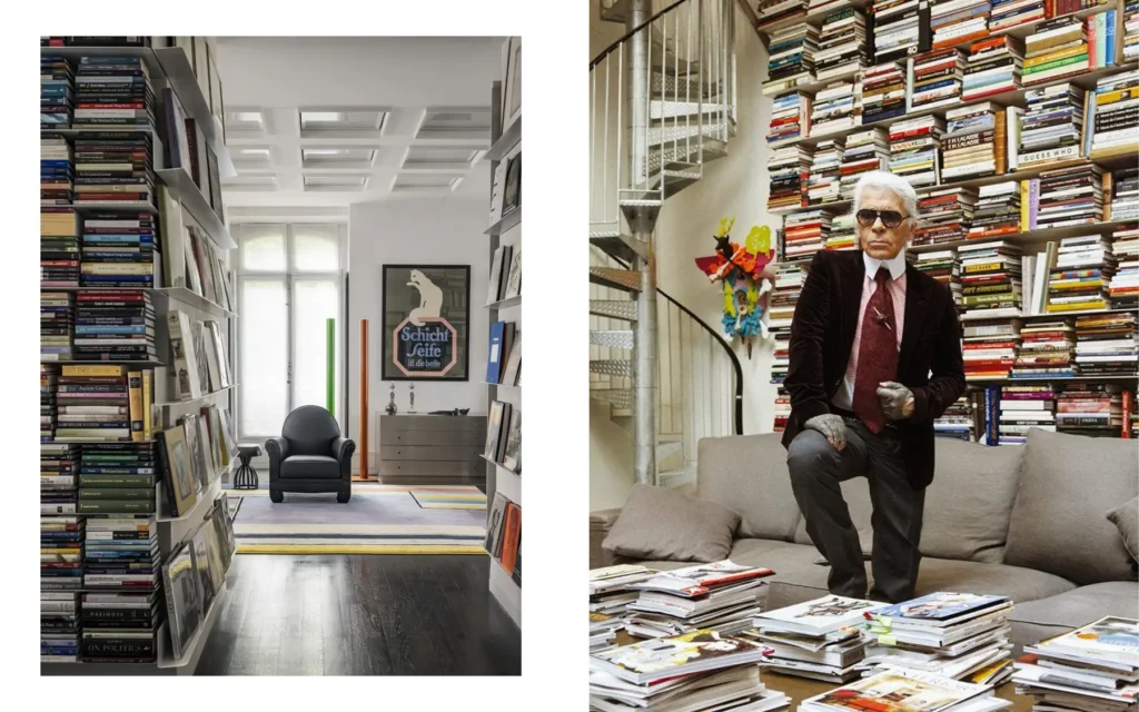 Zgrada iz ranog 19. veka smeštena je u srce šestog arondismana, nekoliko koraka od nekadašnjeg doma Serža Gensbura. Troetažni prostor od 250 kvadratnih metara koji je Lagerfeld koristio kao radni prostor u kom su nastajale kolekcije za Chanel i Fendi, dizajnerka interijera Paulin Leprans pretvorila je u stambeni objekat, ali nije izbrisala njegov karakter. Paleta je čelično siva i bela slonova kost. Tavanice su visoke, sa ogledalima koji multipliciraju prostor i svetlost. Dve čelične biblioteke do plafona, referenca na Lagerfeldovo notorno biblioflistvo, čoveka koji je tokom života sakupio više od 40.000 knjiga i osnovao parisku knjižaru 7L, stoje kao skulpturalni fokusi dnevne sobe.