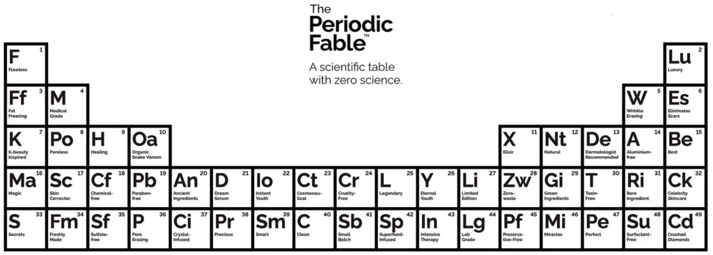 Nas decenijama marketinški slogani ubeđuju da u određenim bočicama kupujemo čudo. Eternal youth, poreless, pore erasing, skin corrector, to su sve izrazi koji su vremenom ušli u upotrebu, dobili moć, ali suštinski izgubili značenje. Ili ga nikad nisu ni imali utemeljenim na nauci. Danas, manje-više, svaka krema obećava rešavanje dosta problema, a The Ordinary je zasmetalo to i rešili su da ovim postave pitanje šta sve te reči i izrazi znače? I zašto im uopšte verujemo? U kampanji koju su pokrenuli, brend na kreativan način doslovno rekonstruiše periodni sistem elemenata, zamenjujući hemijske simbole terminima iz industrije lepote koji se sve češće koriste, a nemaju nikakvu naučnu potporu. Tako nastaje nova tabela istine, kao svojevrsni vodič kroz, naizgled, prazna obećanja. Tabela koja razotkriva šta je lepota, i kako nekad više leži u jeziku koji koristimo, a ne toliko u nauci.